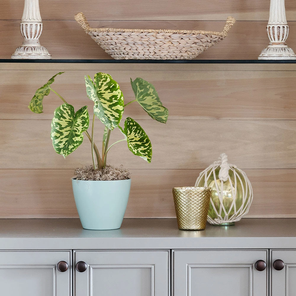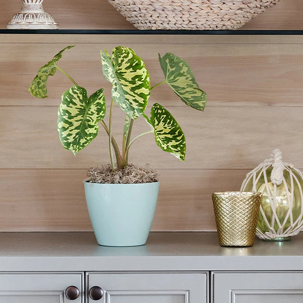 You won’t need to re-pot your Colocasia right away. Only re-pot when it outgrows its shipped container and select a pot that’s about twice the width of the original container. When repotting, make sure to use an organic soil mix in a pot that has adequate drainage.